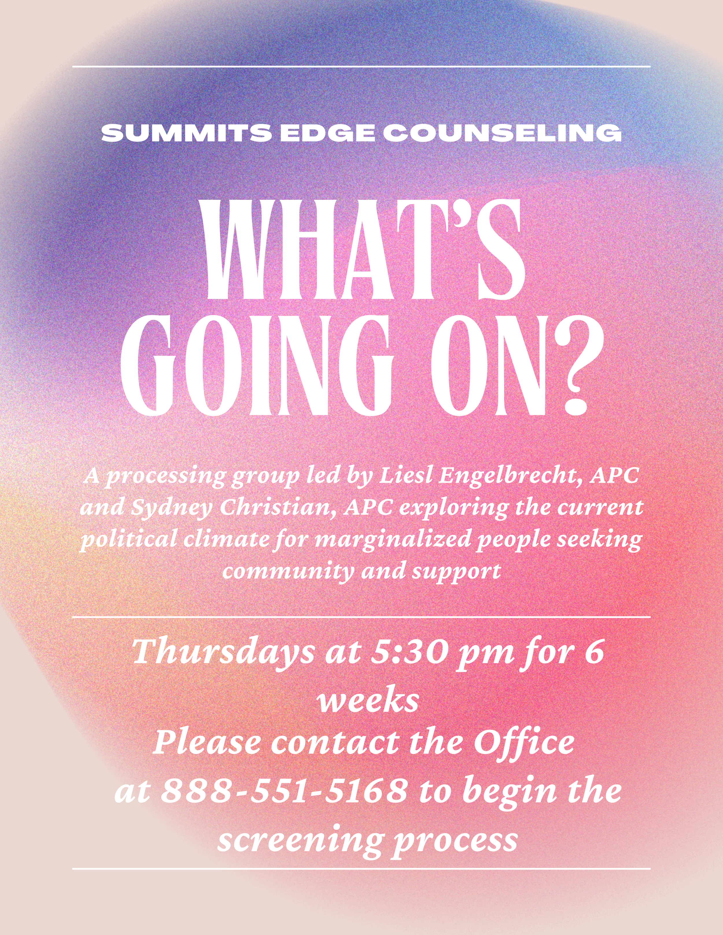 “What’s Going On?”, a biweekly process group for marginalized young adults, co-led by Liesl Engelbrecht (she/her) and Sydney Christian (she/her), both Associate Professional Counselors at Summits Edge Counseling.